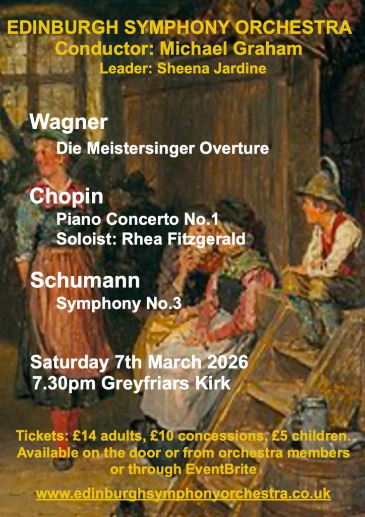Our Spring Concert is on Saturday 7th of March at Greyfriars Kirk and features the very talented young Edinburgh soloist, Rhea Fitzgerald, together with guest conductor Michael Graham. Tickets can be purchased in advance via our ESO Eventbrite page.